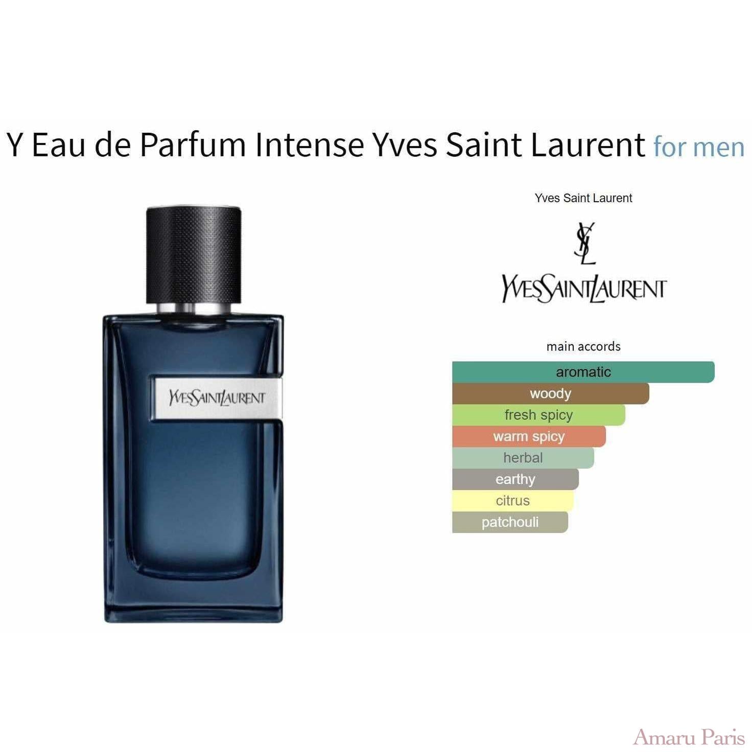Y Eau de Parfum Intense d' Ys Saint Laurent est un parfum aromatique fougère pour homme. Il s'agit d'une nouvelle fragrance. Y Eau de Parfum Intense a été lancée en 2023. Le nez derrière ce parfum est Dominique Ropion. Les notes de tête sont le gingembre, les baies de genièvre et la bergamote ; les notes de cœur sont la sauge, la lavande et le géranium ; les notes de fond sont le vétiver, le patchouli et le cèdre.